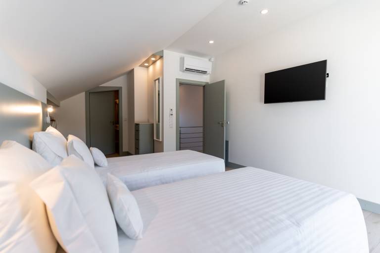 Ein Zweibettzimmer mit zwei Einzelbetten und eigenem Bad, ideal für Kinder oder Freunde, die sich ein Zimmer teilen.
